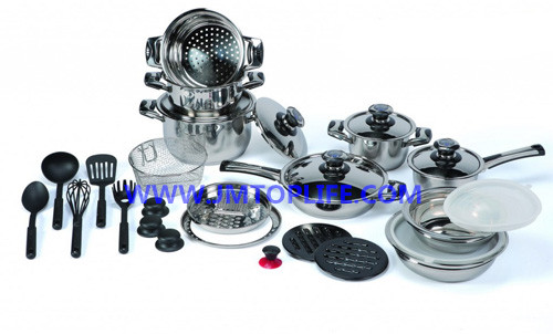 Description: 16X8.0cm saucepan with lid 16x8.0cm casserole with lid 20x12.0cm casserole with lid 24x14.0cm casserole with lid 24x6.5cm fry pan with lid 20x9.5cm steamer 20x6.5cm mixing bowl with plastic lid 24x7.5cm mixing bowl with plastic lid 20cm Frying basket+handle 2 Pcs Bakelite Mat 1 Pc 20cm Grater 1 Pc 24cm Adapter Ring 1 Pc Suction Knob 3 Pc bakelite Knob 5pcs Nylon kitchen tools |
